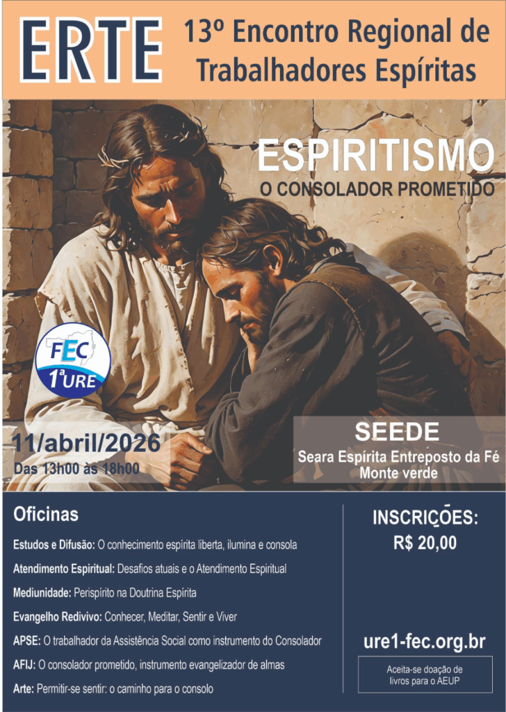 Numa iniciativa que busca a integração entre os trabalhadores das instituições que compõem a 1ª União Regional Espírita da Federação Espírita Catarinense, será realizado no dia 11 de abril de 2026, das 13h às 18h, no SEEDE Seara Espírita Entreposto da Fé , na Servidão Marcelino Gonçalves, 71 – Monte Verde, Florianópolis – SC, 88032-650, a 12ª Edição do ERTE – Encontro Regional dos Trabalhadores Espíritas, com a finalidade de oportunizar uma tarde de Formação e Capacitação nas diversas áreas de atividades do Centro Espírita.